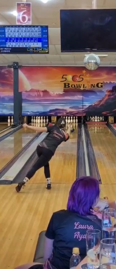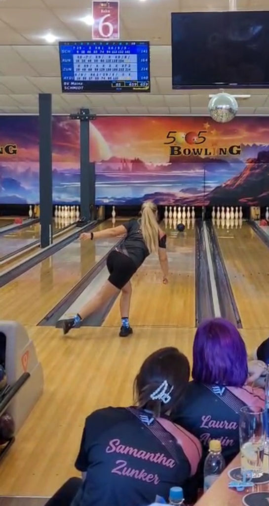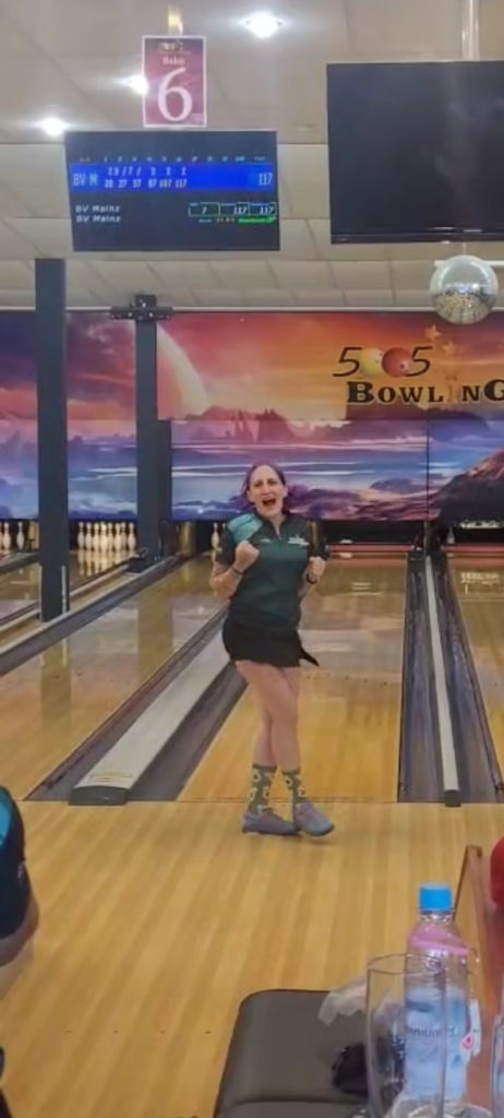 Vor der Mittagspause fielen gegen den BC 2000 Aschaffenburg die Strikes im Akkord: 6 Spielpunkte gaben neuen Schwung. Am Nachmittag legten die Damen noch eine Schippe drauf und spielten eine starke 753er Serie, die 5 Spielpunkte gegen Cosmos Stuttgart einbrachte.